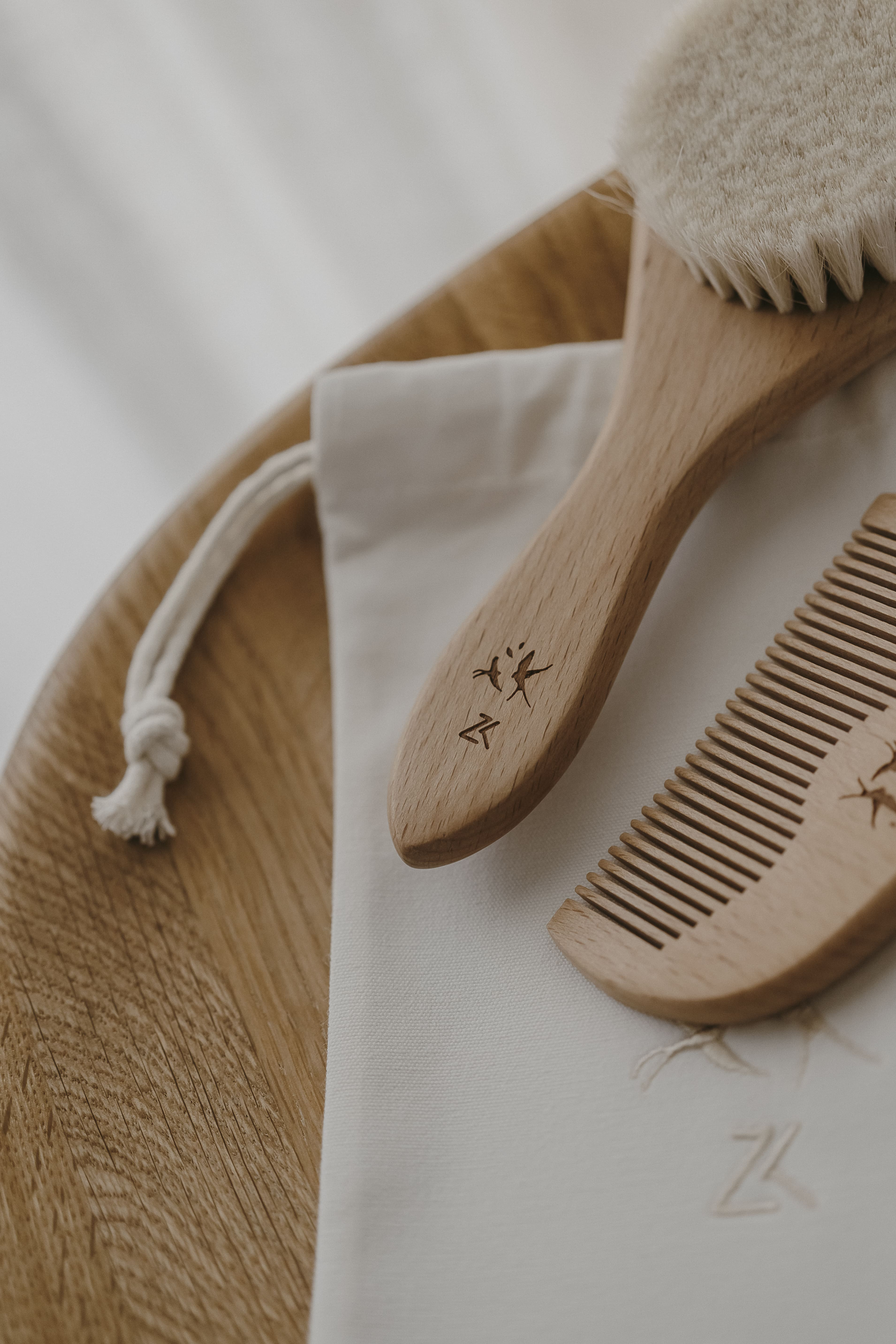 You'll love this pretty baby brush and comb set in beech wood with its swallow engraving and its elegant embroidered storage bag. A nice birth gift idea !