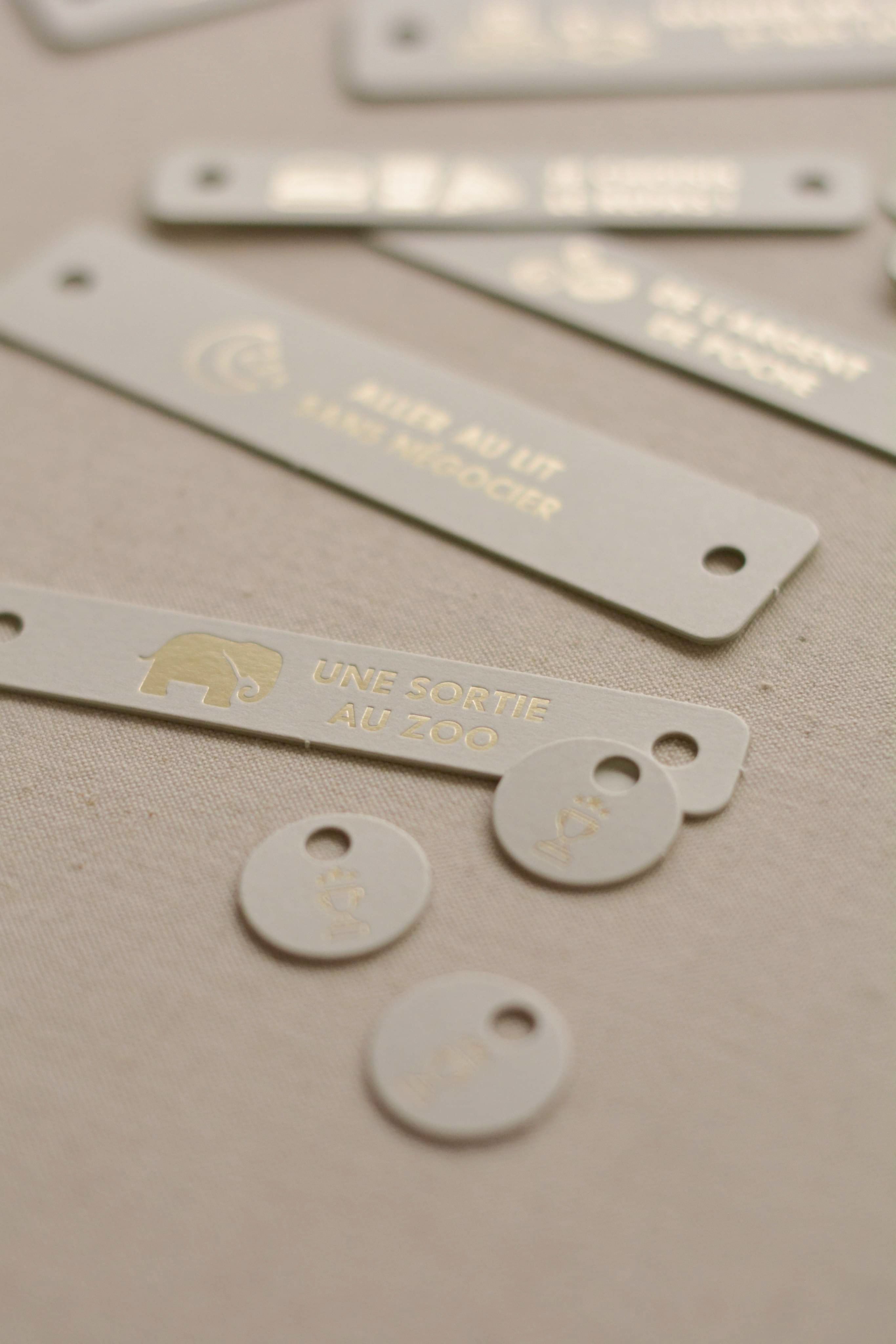 24 cardboard objectives with hot foil stamping (16 pre-printed + 8 blank recto/verso)