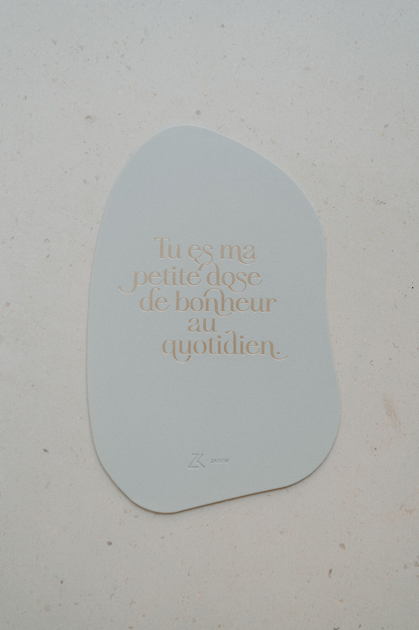 Our pebble-shaped "Bonheur" postcard, with its delicate and poetic style, is designed to celebrate family. Printed in gold letterpress with a tender and timeless message, it naturally finds its place in any interior, placed on a shelf or hung on the wall. It can also accompany a birth gift or serve as a congratulatory card to welcome a new member to the family. A sweet and symbolic little object, to be treasured.