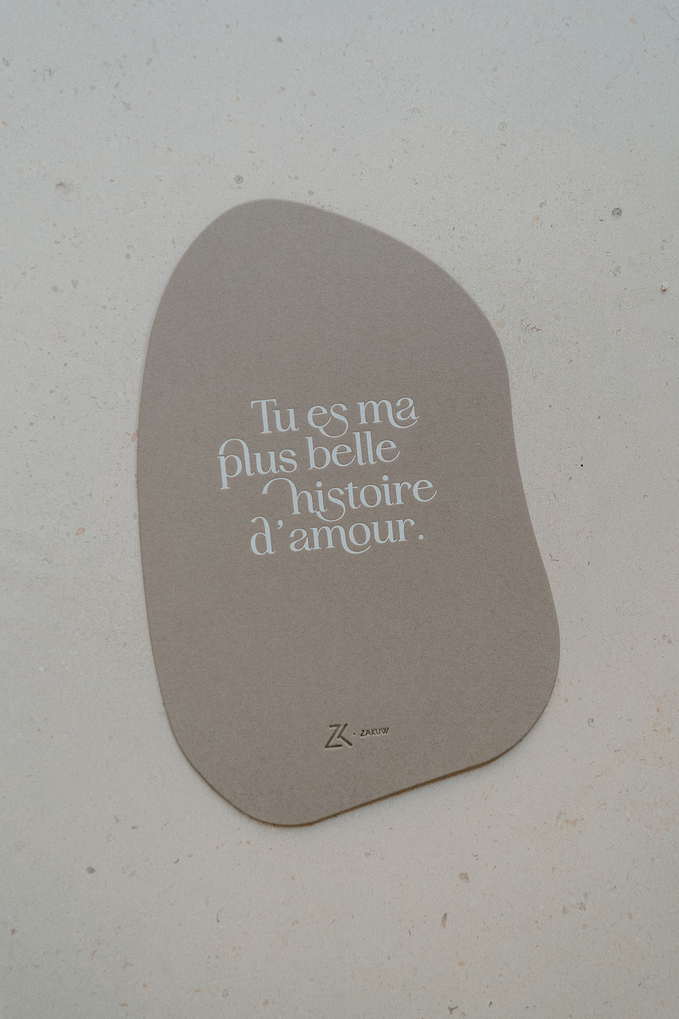 Our pebble-shaped "Histoire d'amour" postcard, with its delicate and poetic style, is designed to celebrate family. Printed in gold letterpress with a tender and timeless message, it naturally finds its place in any interior, placed on a shelf or hung on the wall. It can also accompany a birth gift or serve as a congratulatory card to welcome a new member to the family. A sweet and symbolic little object, to be treasured.