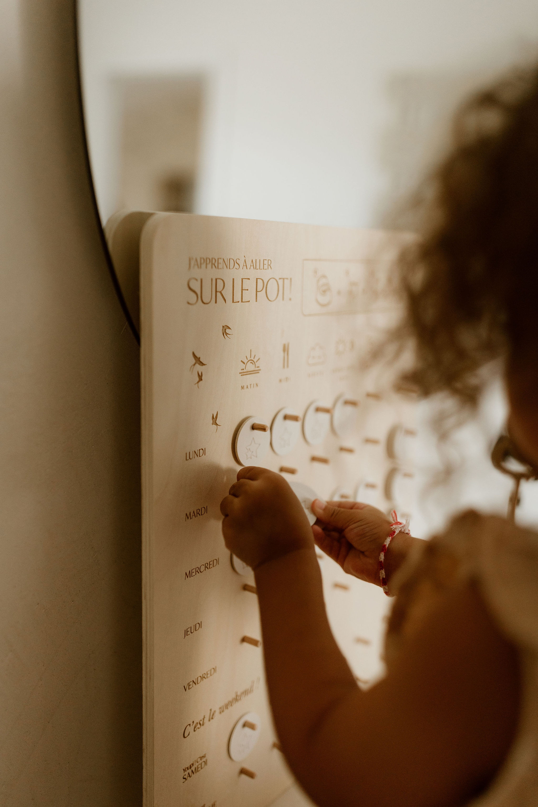 L'acquisition de la continence est une grande étape dans la vie de nos tout petits. Notre tableau d'apprentissage permettre d'aider les enfants (et les parents) dans cette transition, de manière de ludique. L'enfant pourra valider le fait d'être allé sur le pot par une pastille en simili cuir. Un moment qui se transforme en jeu et qui lui rappelle les étapes importantes comme d'aller se laver les mains !