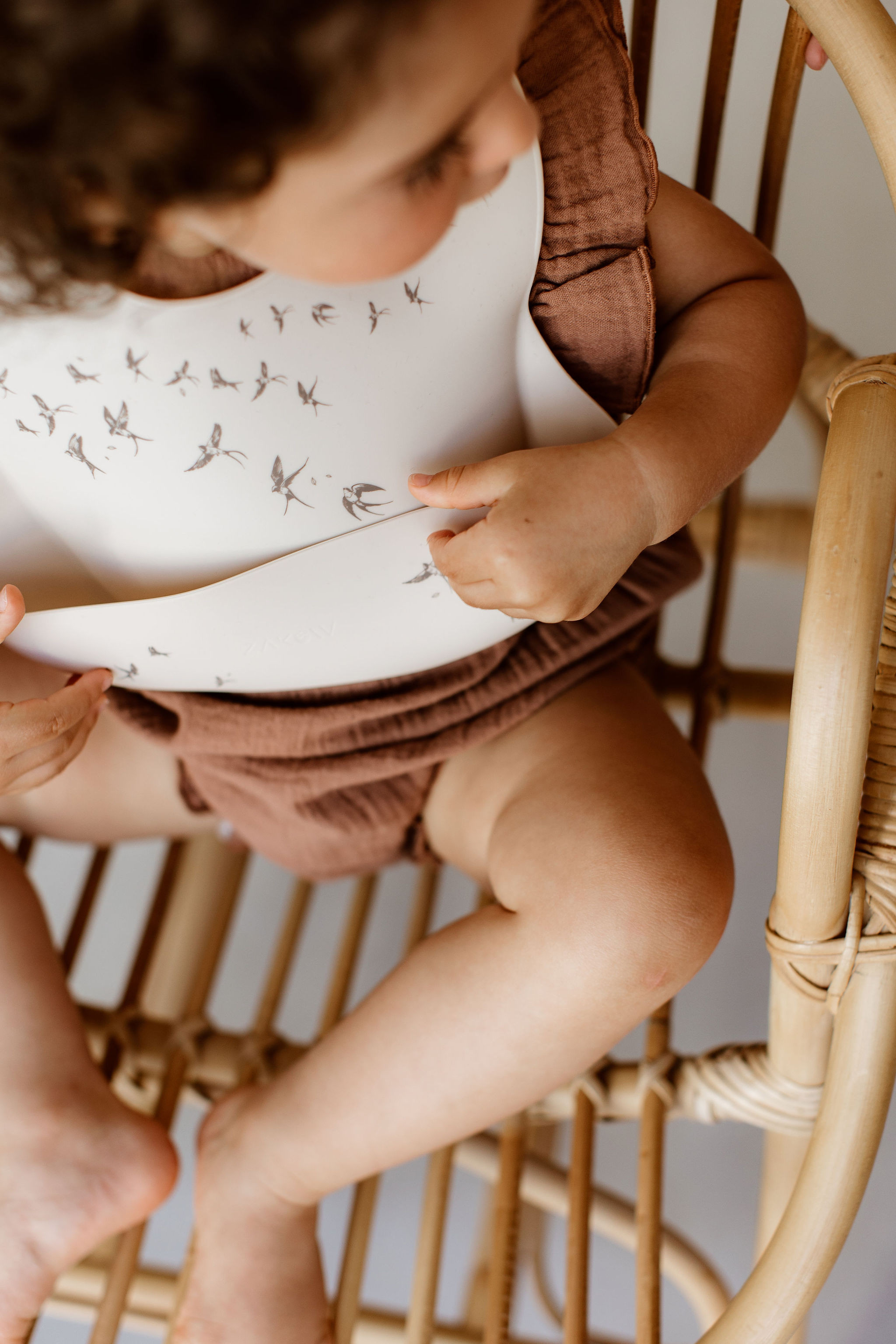 Pour garder les vêtements de votre bébé propres durant ses repas, notre joli bavoir “Hirondelles Sable” aux teintes douces est idéal !