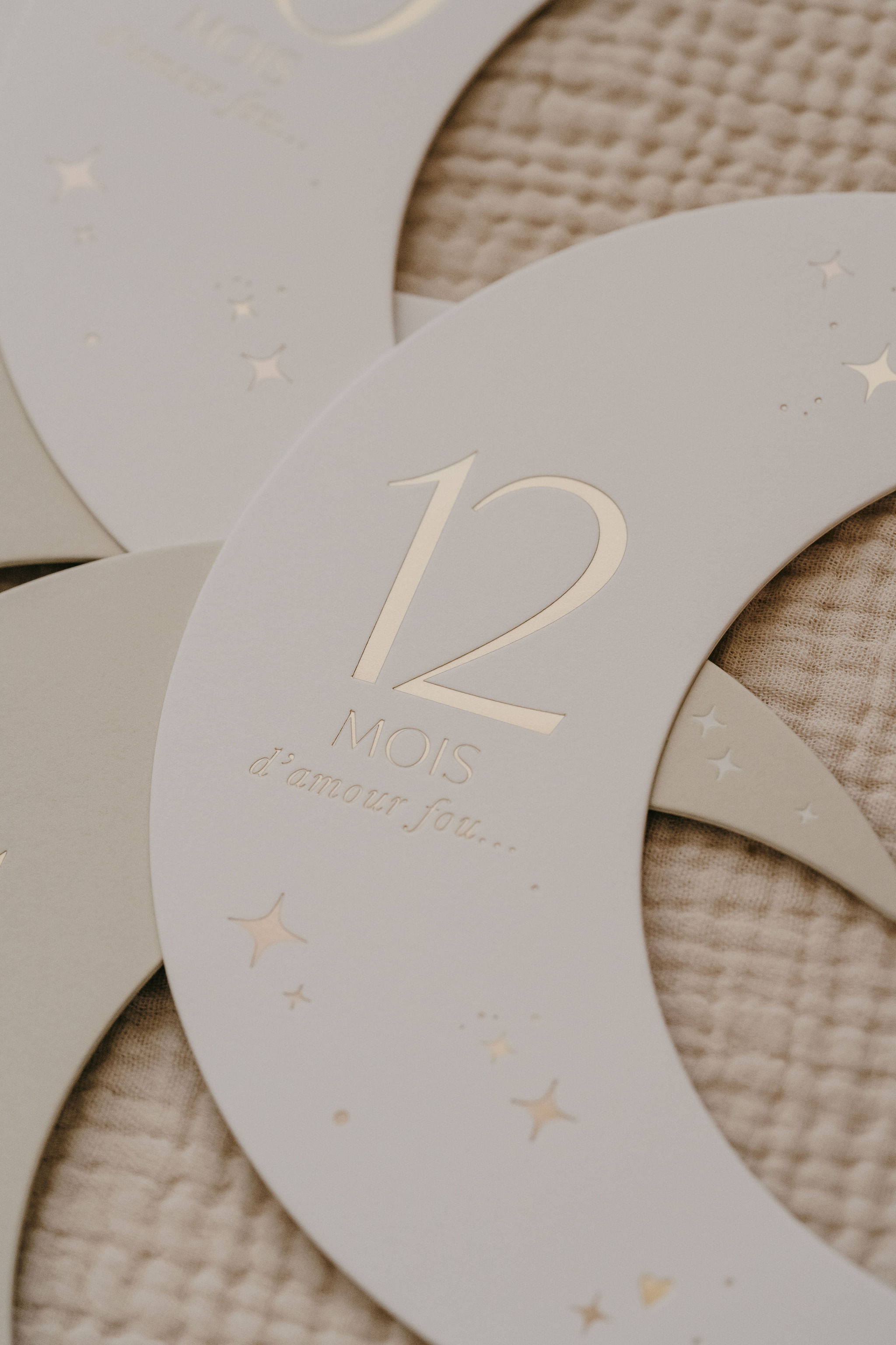 Immortalisez la première année de votre bébé avec le coffret de cartes étapes Moon. Composé de 12 cartes étapes au design poétique, ce coffret vous permettra de prendre de superbes photos souvenirs et d’annoter au dos l’évolution de bébé mois après mois ! Un pochon en coton est également fourni pour conserver précieusement les jolies cartes.