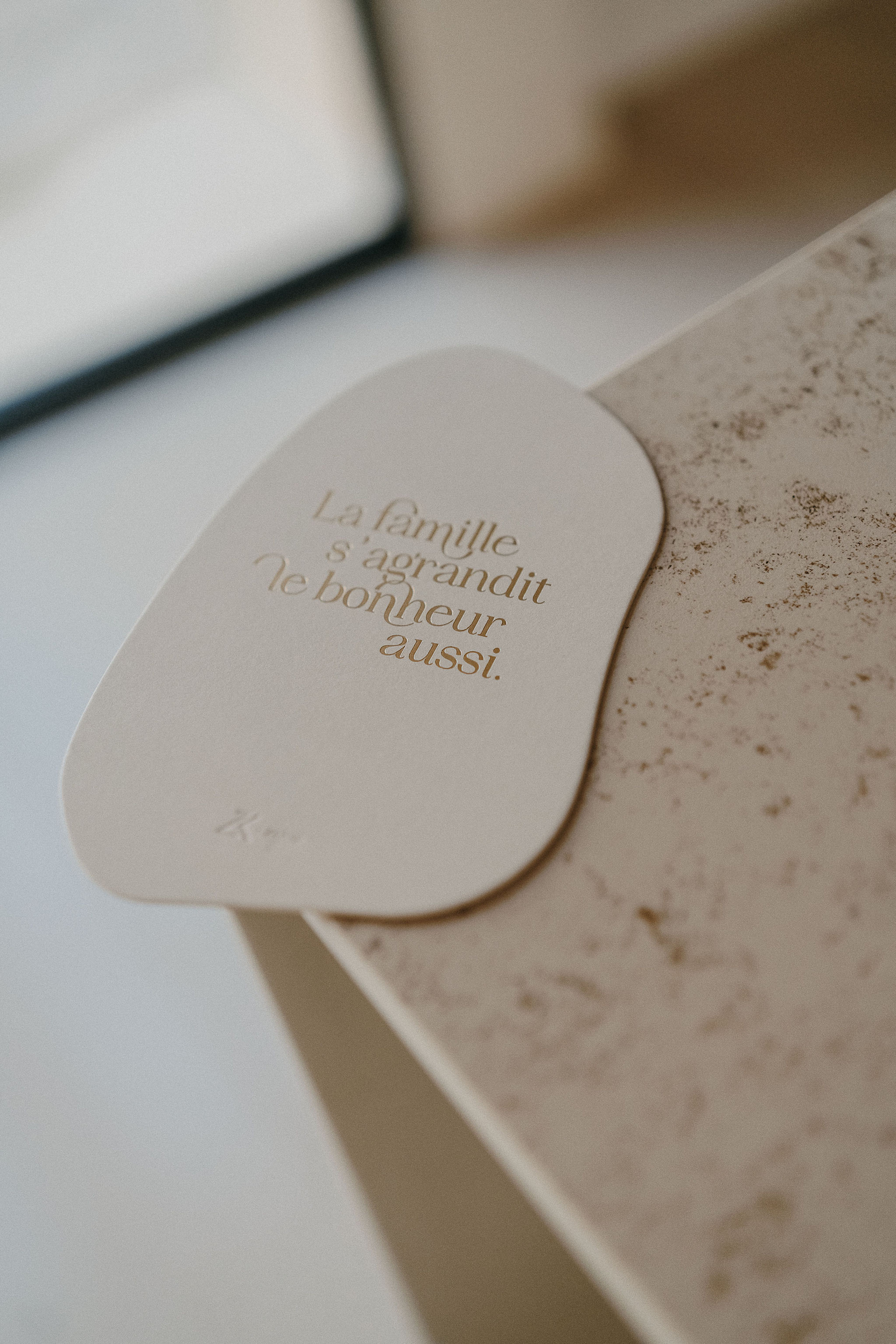 Notre carte postale en forme de galet "Famille", au style délicat et poétique, est pensée pour célébrer la famille. Imprimée en letterpress doré avec un message tendre et intemporel, elle trouve naturellement sa place dans un intérieur, posée sur une étagère ou accrochée au mur. Elle peut également accompagner un cadeau de naissance ou faire office de carte de félicitations pour accueillir un nouveau membre dans la famille. Un petit objet doux et symbolique, à garder précieusement.